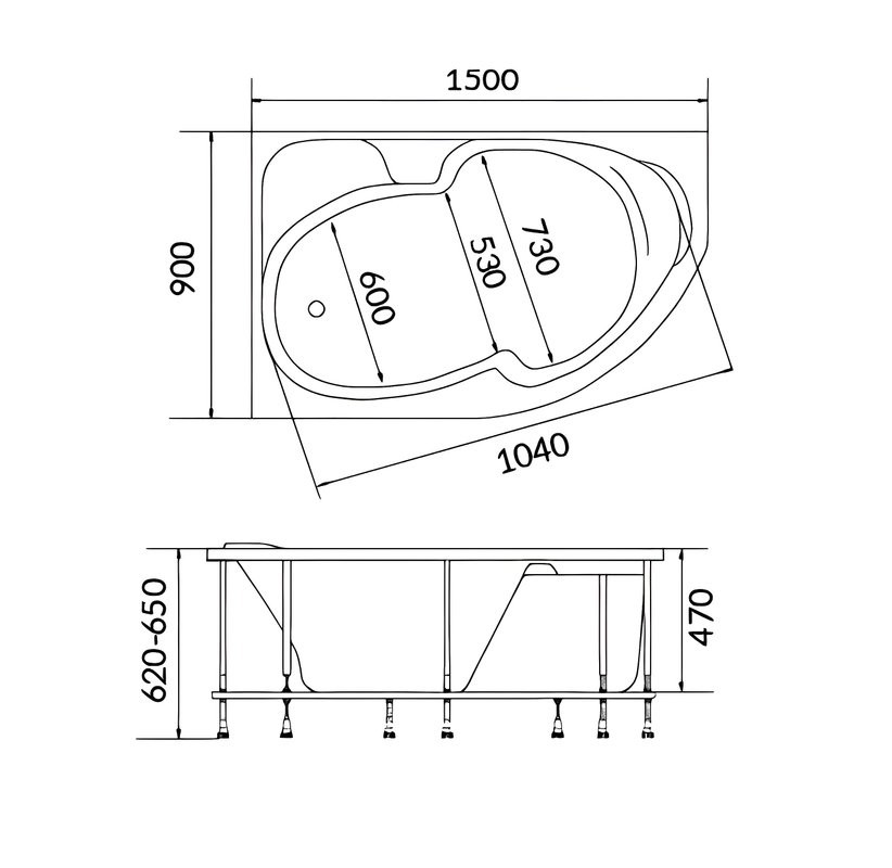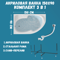 - Комплектация: Акриловая ванна 1MarKa Diana L Стандарт 2+ 150x90 см, угловая, левая, встраиваемая, белая, асимметричная, с каркасом