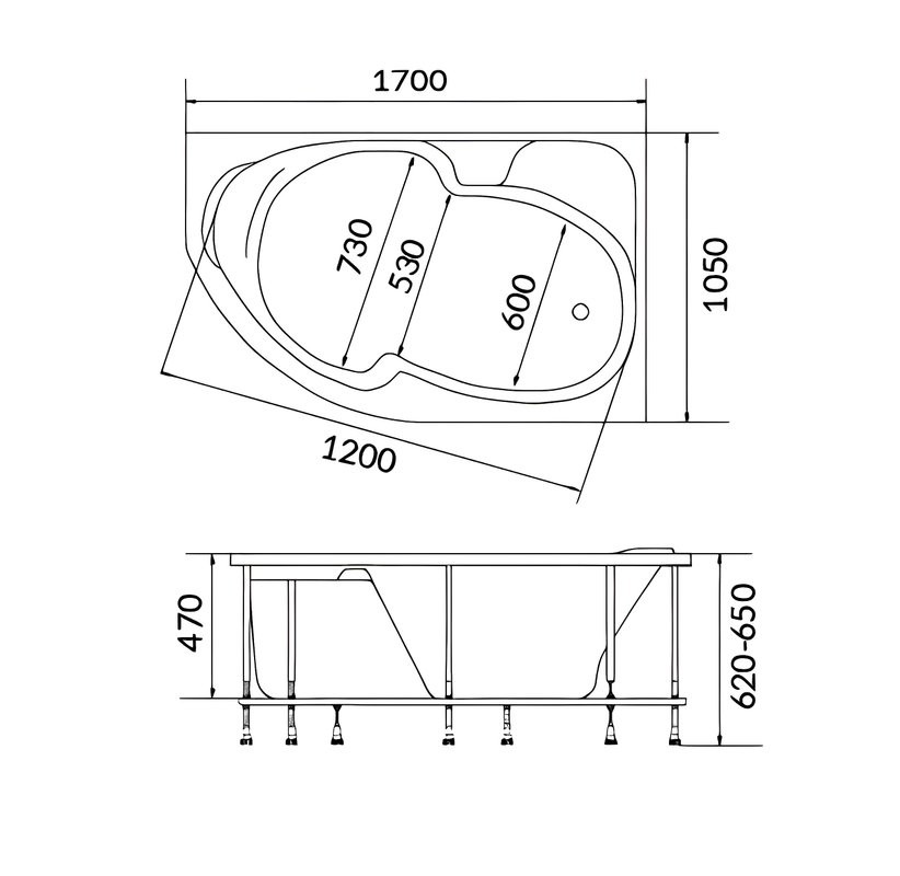 - Комплектация: Акриловая ванна 1MarKa Diana R Стандарт 2+ 170x90 см, угловая, правая, встраиваемая, белая, асимметричная, с каркасо