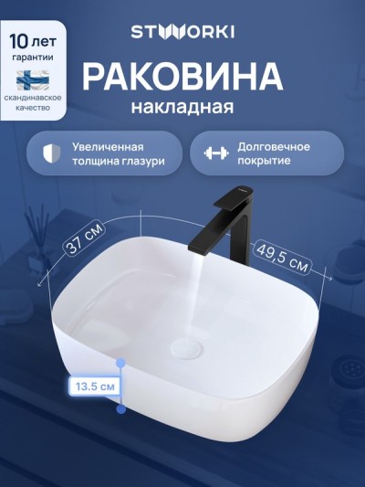 Накладная раковина STWORKI Берген S21411WH 50 глянцевая белая, прямоугольная