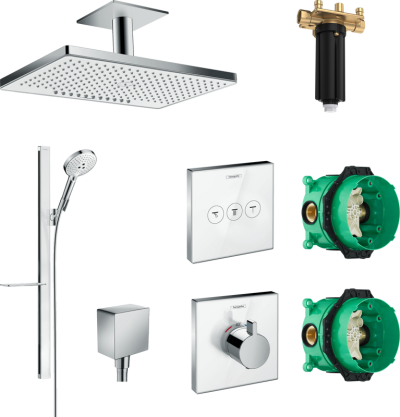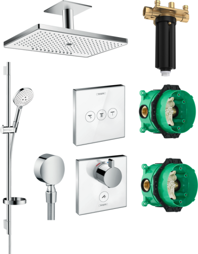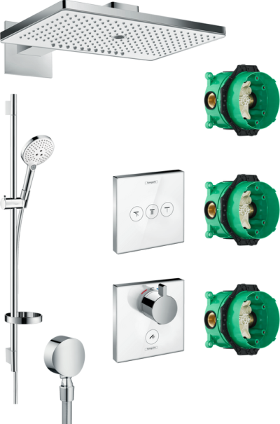 • Комплектация: Скрытая часть Hansgrohe RainSelect 15311180; Скрытая часть Hansgrohe Ibox Universal 01800180; Душевая лейка Hansgrohe Raindance Select S 120 3jet 26530400; Душевой шланг Hansgrohe Isiflex; Верхний душ Hansgrohe Rainmaker Select 460 24005400, белый - хром