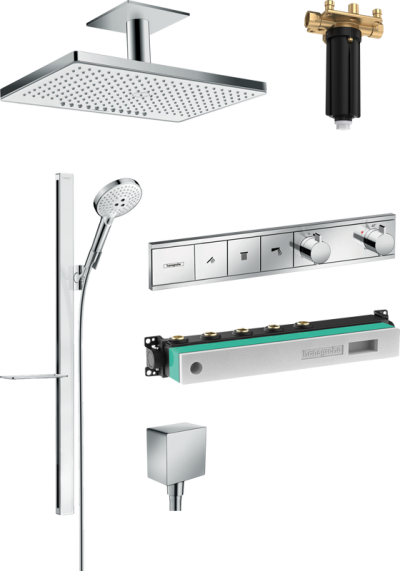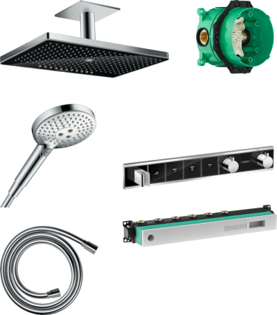 • Комплектация: Скрытая часть Hansgrohe Ibox Universal 01800180; Скрытая часть Hansgrohe RainSelect 15312180; Душевая лейка Hansgrohe Raindance Select S 120 3jet 26530000; Душевой шланг Hansgrohe Isiflex; Верхний душ Hansgrohe Rainmaker Select 460 24007600, черный - хром