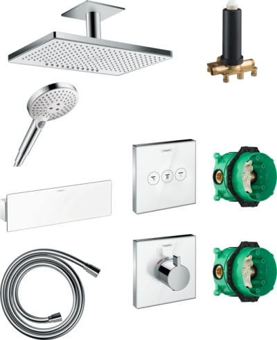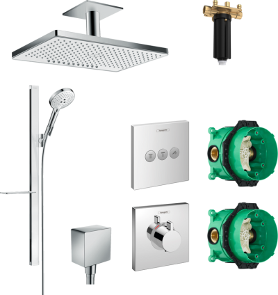 - Комплектация: Душевой гарнитур Hansgrohe Raindance Select S 150 26626000, Unica'S; Верхний душ Hansgrohe Rainmaker Select 580 3jet 24001600, черный - хром; Шланговое подключение Hansgrohe FixFit Fixfit S 27506000; Скрытая часть Hansgrohe Ibox Universal 01800180