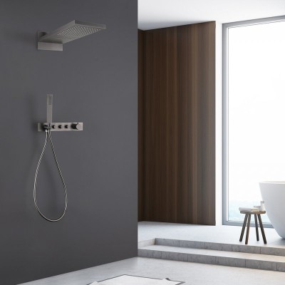 - Состав комплекта: {Смеситель для ванны с душем;Верхний душ;Душевой гарнитур;Излив;Шланговое подключение}