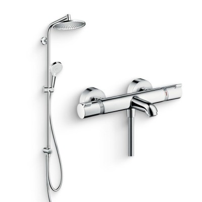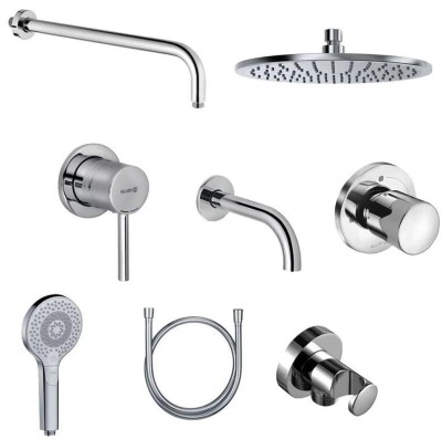 - Состав комплекта: {Смеситель для ванны с душем;Верхний душ;Душевой гарнитур;Излив;Настенный держатель}