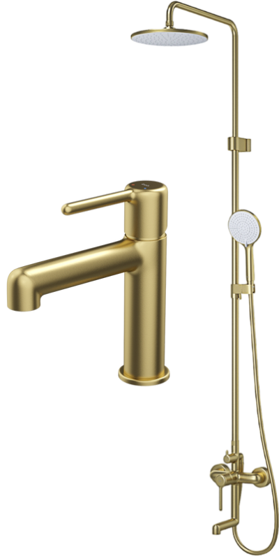 - Состав комплекта: {Смеситель для ванны с душем;Верхний душ;Душевой гарнитур;Излив;Переключатель потоков;Шланговое подключение}