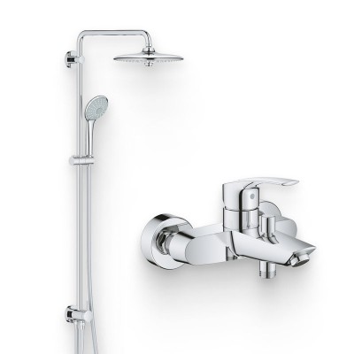 - Состав комплекта: {Смеситель для ванны с душем;Верхний душ;Душевой гарнитур;Настенный держатель;Шланговое подключение}