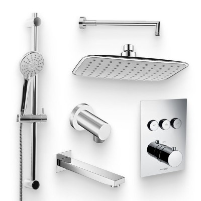 - Состав комплекта: {Смеситель для ванны с душем;Верхний душ;Душевой гарнитур;Настенный держатель;Шланговое подключение}