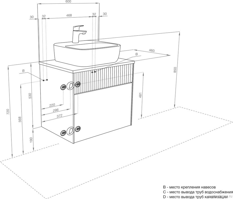 - Ширина основания с раковиной: 60