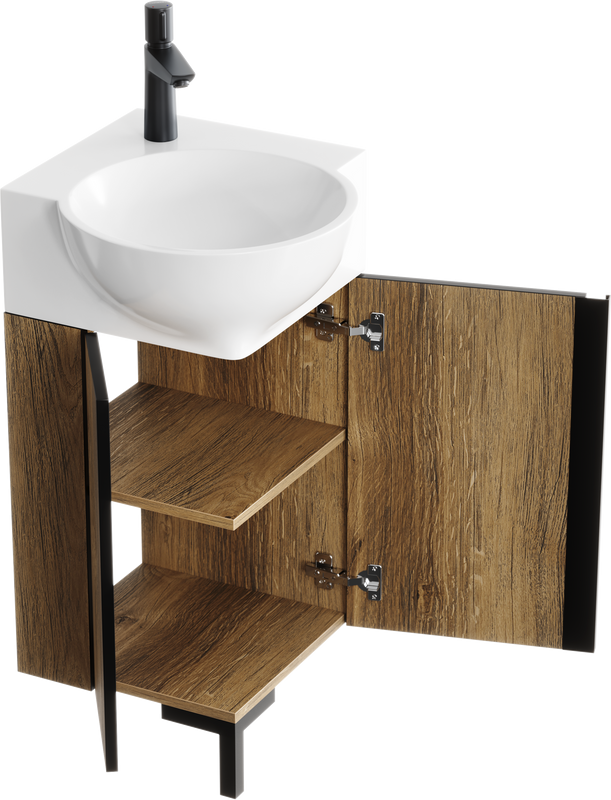 - Комплектация: Тумба под раковину Aqwella Porto 45, угловая, дуб балтийский, фурнитура черная; Мебельная раковина Aqwella Дельта; Угловой зеркальный шкаф Aqwella Рио 45