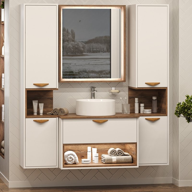 - Комплектация: Тумба под раковину Brevita Bergen 80, подвесная, с подсветкой, дуб галифакс олово, белый; Накладная раковина Melana; Зеркало Brevita Dallas, 70 с полкой