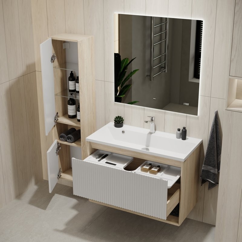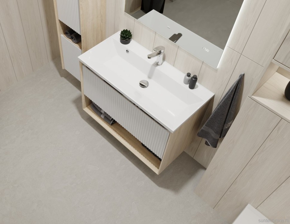 - Комплектация: Тумба под раковину Jorno Tossony 90, сонома светлая, белый; Мебельная раковина Madera Classica, 90; Зеркало Raval Kvadro, 80 с подсветкой, с часами