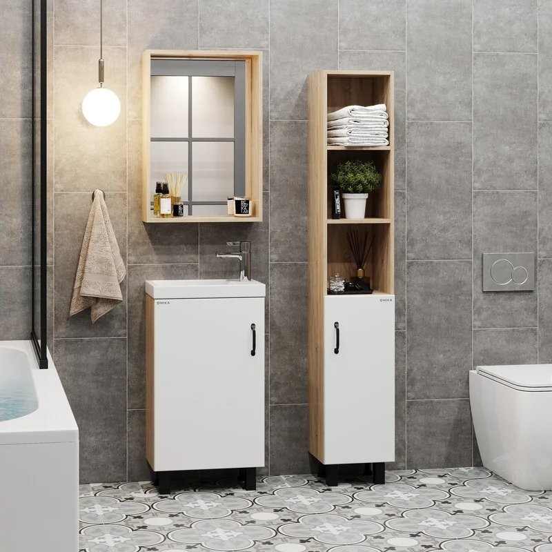 - Комплектация: Тумба под раковину Onika Тимбер 45, белая матовая, дуб сонома; Раковина маленькая в туалет Kirovit Фостер 450; Зеркало Onika Тимбер, 48 дуб сонома