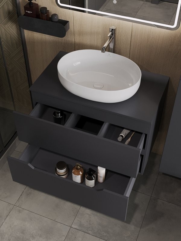 - Комплектация: Тумба под раковину со столешницей Orange Line 80, подвесная, 2 ящика, матовый графит; Накладная раковина Orange B07 B05-520W, 52 см белый глянец; Зеркало Orange Nature ON-80ZE, с LED подсветкой
