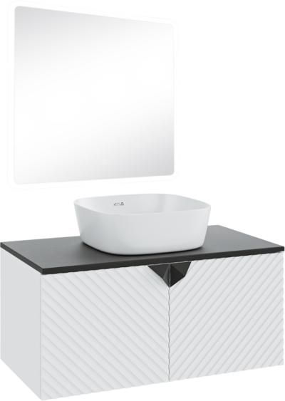 - Комплектация: Тумба под раковину Runo Андорра 85, белая матовая, белый глянец; Накладная раковина Runo Bella 40; Зеркало Runo Руан, 80х80 с подсветкой