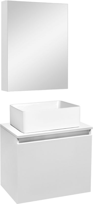 - Комплектация: Тумба под раковину Runo Бари 50, железный камень; Накладная раковина Runo Duo 40; Зеркало-шкаф Runo Лада 50 белое