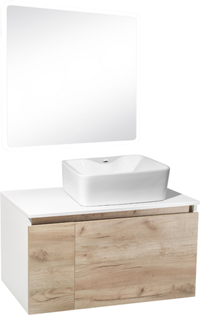 - Комплектация: Тумба под раковину Runo Бари 80, крафтовый дуб; Накладная раковина Runo Tre 50; Зеркало Runo Руан, 80х80 с подсветкой