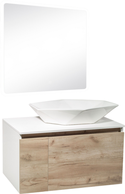 - Комплектация: Тумба под раковину Runo Бари 80, железный камень; Накладная раковина Runo Poligono 65; Зеркало Runo Руан, 80х80 с подсветкой