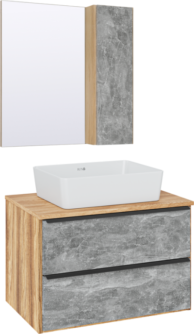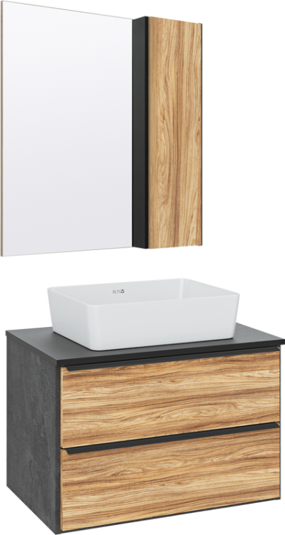 - Комплектация: Тумба под раковину Runo Мальта, 70, подвесная, дуб, черная; Накладная раковина Runo Lavello 50; Зеркало Runo Мальта, 70, дуб, черный