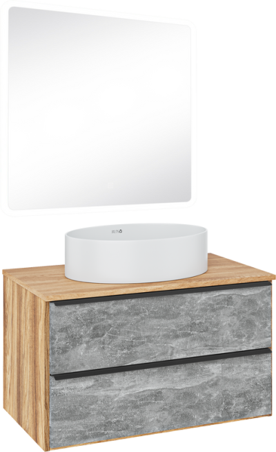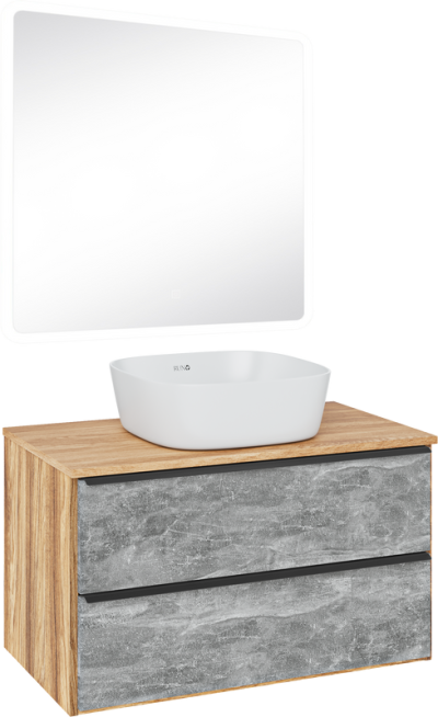 - Комплектация: Тумба под раковину Runo Мальта, 85, подвесная, дуб, черная; Накладная раковина Runo Ovale 50; Зеркало Runo Руан, 80х80 с подсветкой