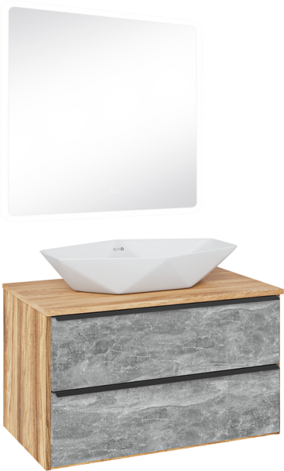 - Комплектация: Тумба под раковину Runo Мальта, 85, подвесная, дуб, черная; Накладная раковина Runo Poligono 65; Зеркало Runo Руан, 80х80 с подсветкой