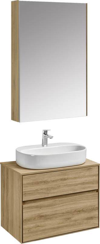- Комплектация: Тумба под раковину Runo Мальта, 85, подвесная, дуб, серая; Накладная раковина Runo Palla 40; Зеркало Runo Руан, 80х80 с подсветкой