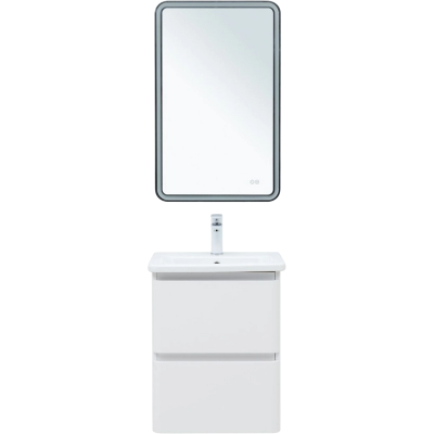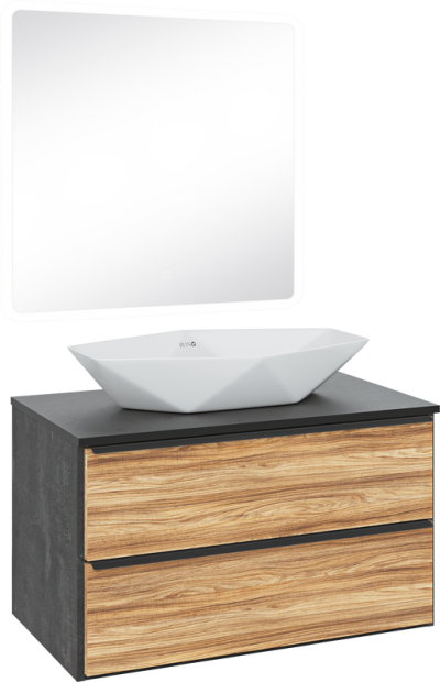 - Комплектация: Тумба под раковину Runo Мальта, 85, подвесная, дуб, серая; Накладная раковина Runo Poligono 65; Зеркало Runo Руан, 80х80 с подсветкой