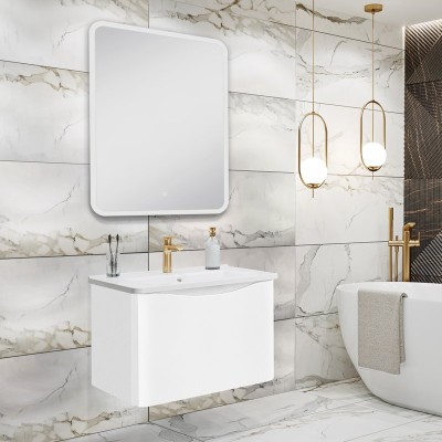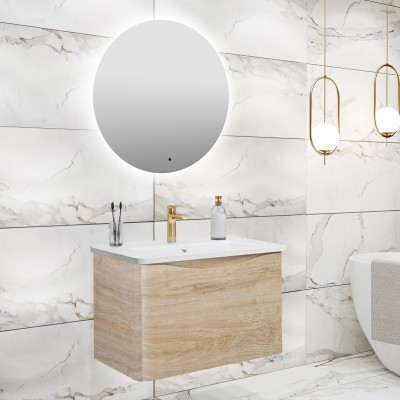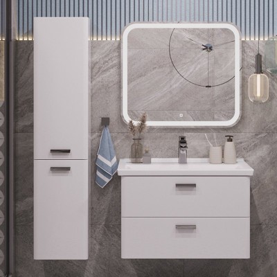 - Комплектация: Тумба под раковину Runo Модена 75, белый; Мебельная раковина Kirovit Оскар, 75; Зеркало круглое Runo Руан, 65 с подсветкой; Шкаф пенал для ванной Runo Модена 40, белый