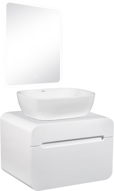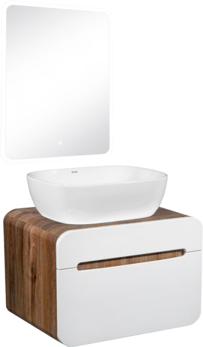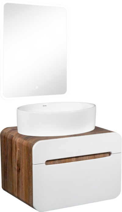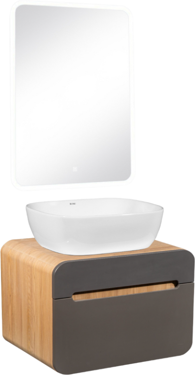 - Комплектация: Тумба под раковину Runo Ницца 60, дуб натуральный, графит; Накладная раковина Runo Ovale 50; Зеркало Runo Руан, 60х80 с подсветкой