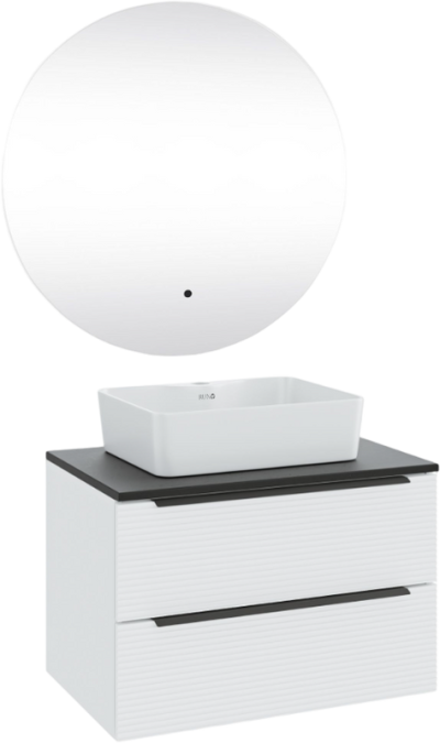 - Комплектация: Тумба под раковину Runo Орлеан 70, зеленая, дуб натуральный; Накладная раковина Runo Lavello 50; Зеркало круглое Runo Руан, 65 с подсветкой