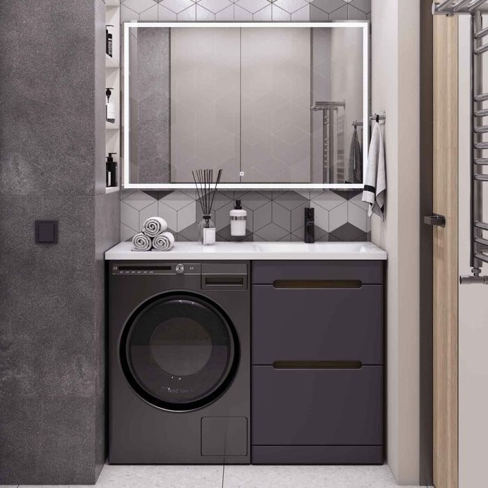 - Комплектация: Тумба под раковину SanStar Darko 50, напольная, под стиральную машину, дуб вотан, графит софт; Раковина над стиральной машиной Эстет Даллас 110 R, белая; Кронштейн Эстет Даллас ФР-00012748, универсальный; Зеркало SanStar Oscar, 100 с подсветкой