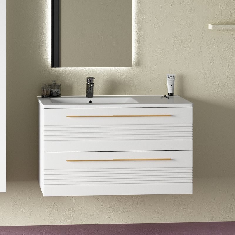- Комплектация: Тумба под раковину Sanvit Соната 2-90 L, 2 ящика, белая; Мебельная раковина Sanvit 9090E, L; Зеркало Sanvit Кубэ, 100