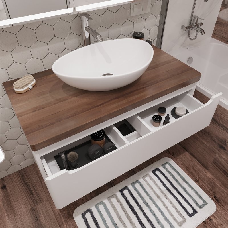 - Комплектация: Тумба под раковину STWORKI Берген 100, белая; Столешница в ванную под раковину STWORKI Берген 100, темная; Накладная раковина Cersanit Moduo 55 Leaf; Сифон для раковины Wirquin Минор 30718050, с выпуском 1 1/4 х 40 мм; Зеркало DIWO Новгород, 100 с подсвет