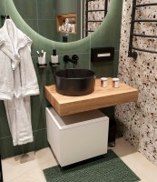 - Комплектация: Столешница в ванную под раковину STWORKI Ольборг 80, без отверстий, дуб французский; Накладная раковина BOCCHI Vessel 1174-004-0125, черная матовая; Зеркало круглое STWORKI Мальмё, 100 с ореольной подсветкой, сенсор на зеркале, круглое, настенное; Тумба S