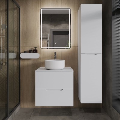 - Комплектация: Тумба под раковину без столешницы Тумба под раковину без столешницы SanStar Ориана 60 подвесная, серая; Мебельная раковина Мебельная раковина Dreja Грейс 60 накладная, белая, прямоугольная, фарфор; Зеркало Зеркало SanStar Varna 60 с подсветкой
