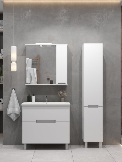 - Комплектация: Тумба под раковину без столешницы Тумба под раковину без столешницы SanStar Siva 80 подвесная, дуб вотан; Мебельная раковина Мебельная раковина Cersanit Como 80 накладная, белая, прямоугольная, фарфор; Зеркало Зеркало SanStar Varna 80 с подсветкой
