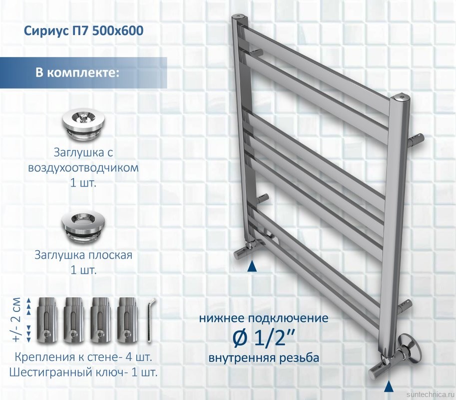 • Комплектация: Полотенцесушитель водяной AQUATEK Сириус П7 50x60, хром
