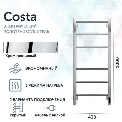 Описание для товара Полотенцесушитель электрический Grota Costa 430х1000 NM EL 100x45 см, подключение справа, слева, скрытое подключение справа, матовый хром, лесенка скоро обновится