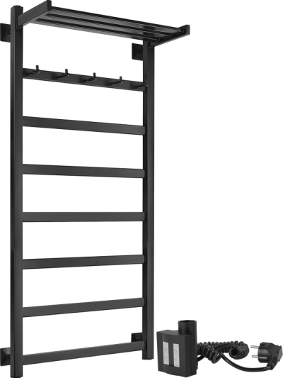 - Комплектация: Полотенцесушитель электрический Полотенцесушитель электрический Secado Корсико 1 КСП , 105x55 см, скрытое подключение слева, матовый черный, лесенка, с полкой
