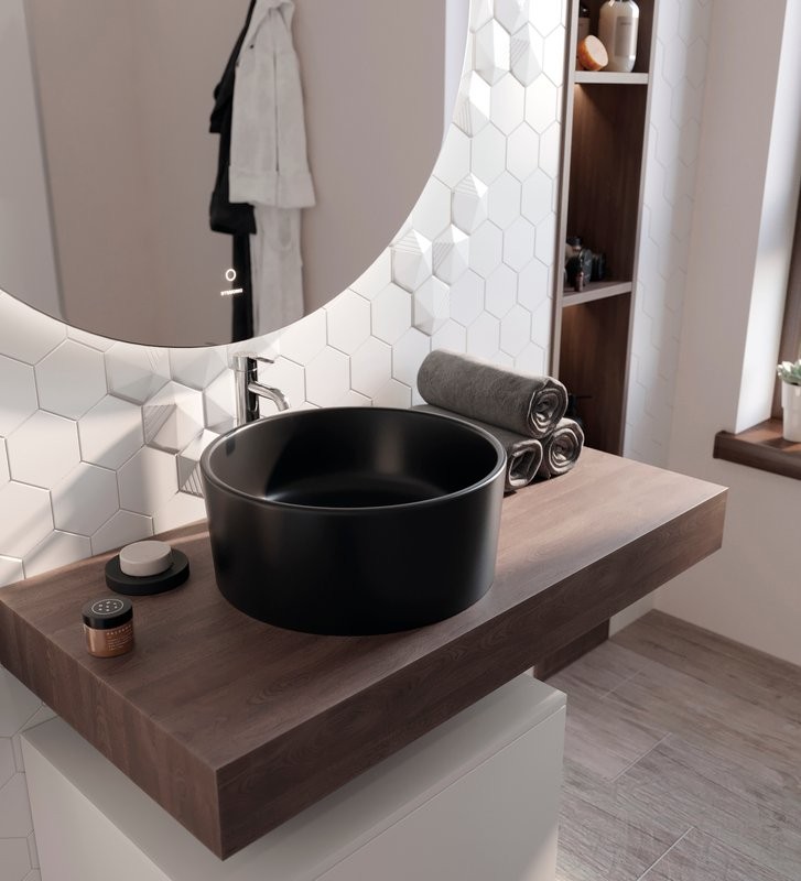 - Комплектация: Столешница в ванную под раковину STWORKI Ольборг 100, без отверстий, дуб карпентер; Накладная раковина BOCCHI Vessel 1174-004-0125, черная матовая; Тумба STWORKI Ольборг 60