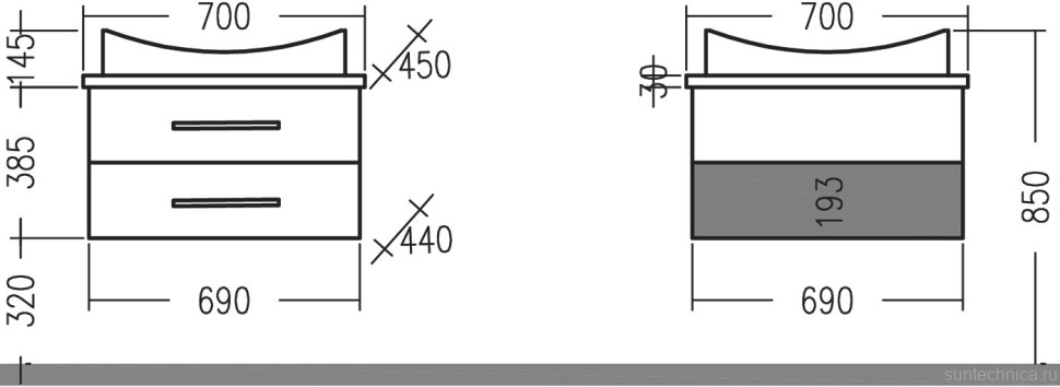 - Комплектация: Тумба под раковину СаНта Вегас 70, подвесная, 2 ящика