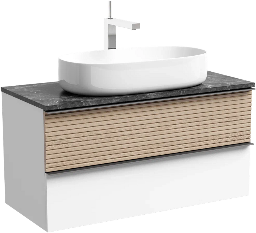 - Комплектация: Тумба под раковину Sancos Delta 100, дуб светлый, белый; Столешница в ванную под раковину Sancos TT100A1X, черный мрамор, с отв. под смеситель