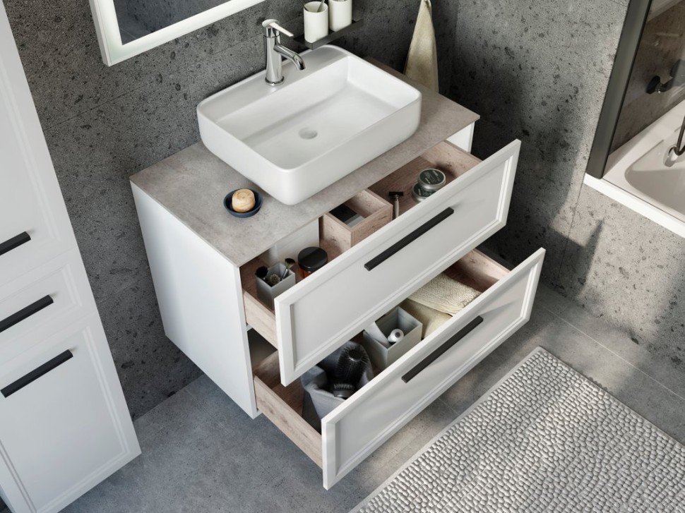 - Комплектация: Тумба под раковину STWORKI Эстерсунд 90, белая матовая; Столешница в ванную под раковину STWORKI 90, простоун беж