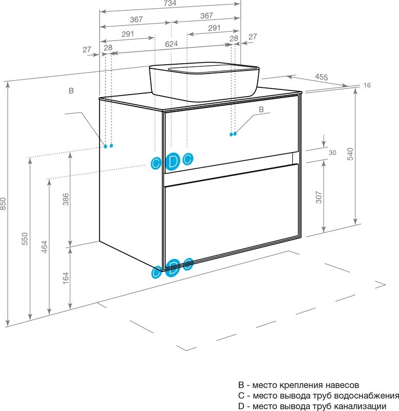 - Дополнительная информация: высота тумбы под вкладную раковину - 55 см (больше за счет опорных планок, которые нужно удалить при монтаже накладной раковины), под накладную - 54 см