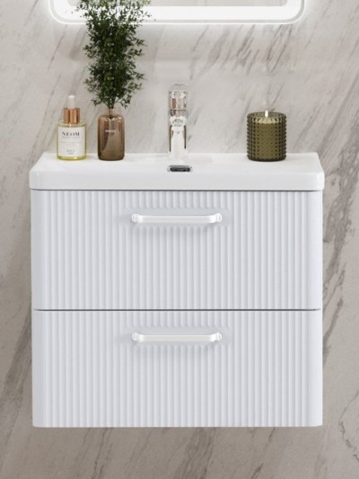 • Комплектация: Тумба под раковину BelBagno Due 60, подвесная, белый металлик; Мебельная раковина BelBagno 61, глянцевая белая; Ручка для мебели BelBagno, сатиновый никель