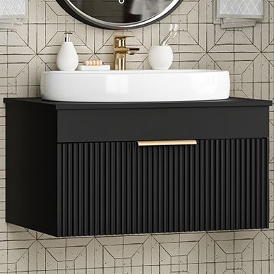 - Комплектация: Тумба под раковину Brevita Enfida 70, подвесная, черная; Накладная раковина DIWO Самара, 62 см, накладная чаша на столешницу, фаянсовая, овальная, белая
