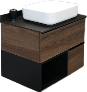 - Комплектация: Тумба под раковину со столешницей Orange Line 60, подвесная, 2 ящика, матовый графит; Мебельная раковина Orange B02 B04-405W, белый глянцевый