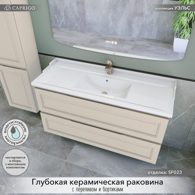 • Комплектация: Тумба под раковину без столешницы Тумба под раковину без столешницы Caprigo Wales 120 шоколадный орех; Мебельная раковина Мебельная раковина Caprigo Y 120 накладная, глянцевая белая, прямоугольная, фарфор
