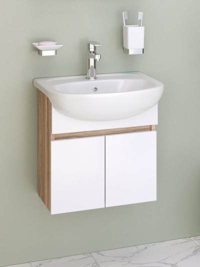 - Комплектация: Тумба под раковину без столешницы Тумба под раковину без столешницы Runo Лада 50 подвесная, крафтовый дуб; Мебельная раковина Мебельная раковина Rosa Уют 51 накладная, белая, полукруглая, фаянс