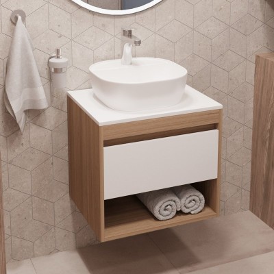 - Комплектация: Тумба под раковину со столешницей Тумба подвесная Teymi Nura 60, дуб эврика/белый матовый T60527; Накладная раковина Раковина накладная Teymi Lori 60, белая T50503