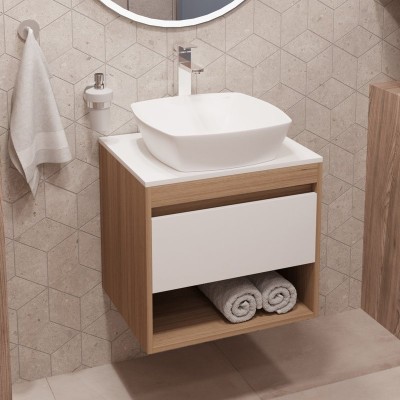 - Комплектация: Тумба под раковину со столешницей Тумба подвесная Teymi Ritta 55, ящик с доводчиком, цвет дуб эврика/графит матовый T60523; Накладная раковина Раковина накладная Teymi Kati 43, белая T50701
